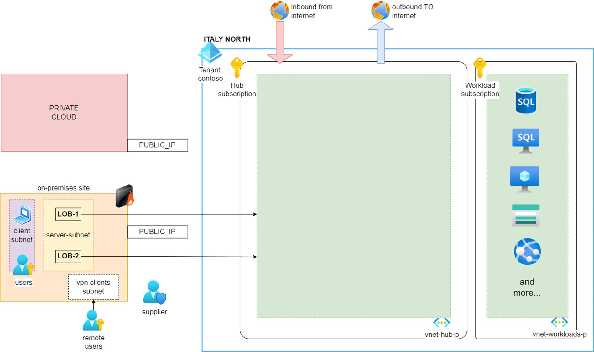 A completare lo schema, riportiamo qualche esempio di workload misti (di tipo IaaS e PaaS) che ospiteranno le nostre applicazioni e che dobbiamo connettere col resto degli “elementi”