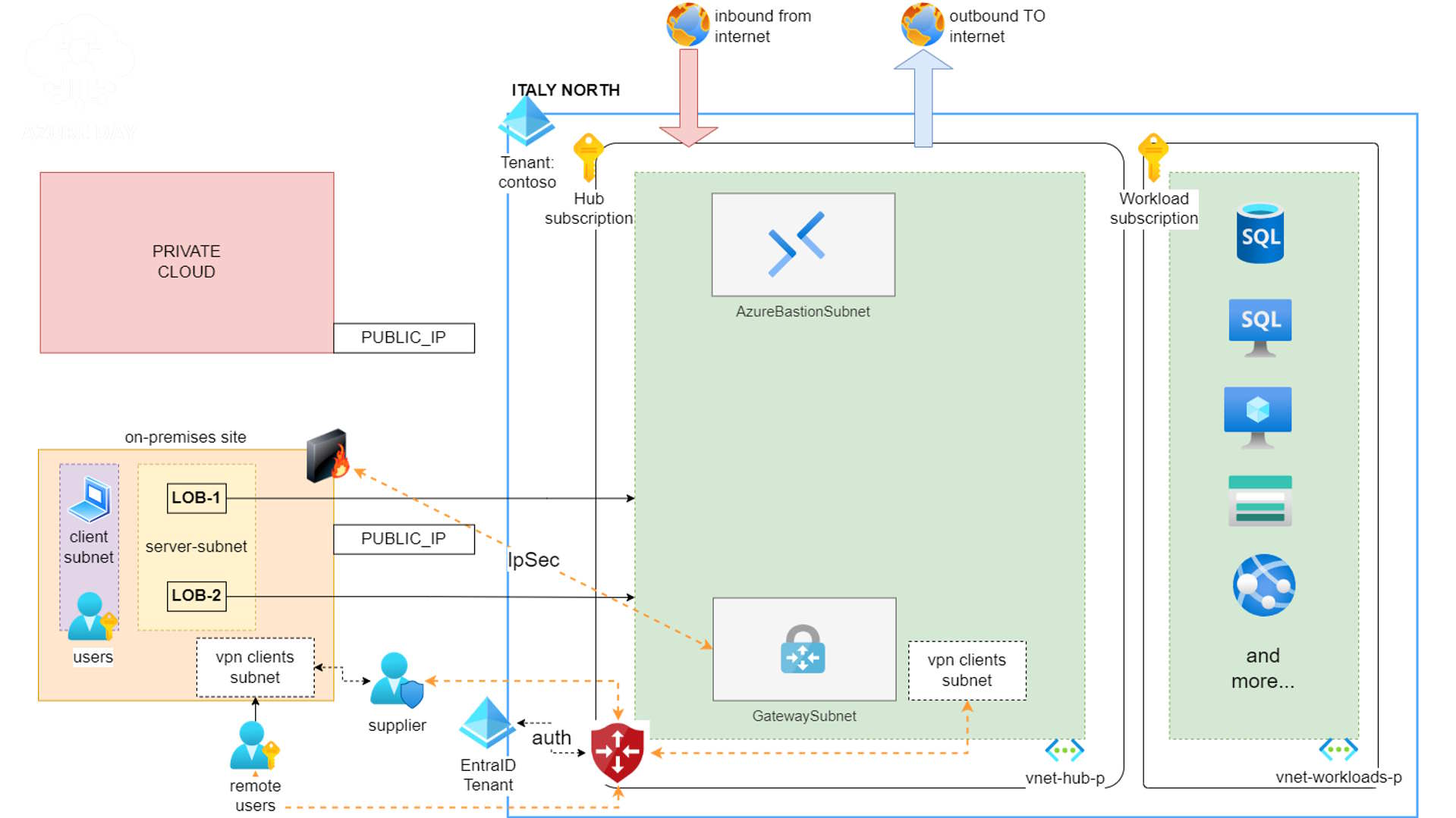1) La sottorete su azure da cui viene assegnato un indirizzo IP privato ad ogni client che si connette in VPN P2S (nel disegno vpn clients subnet su azure) è unica per tutti. non riusciamo a distinguere le personas e quindi non riusciamo a fornirgli accessi differenti.
